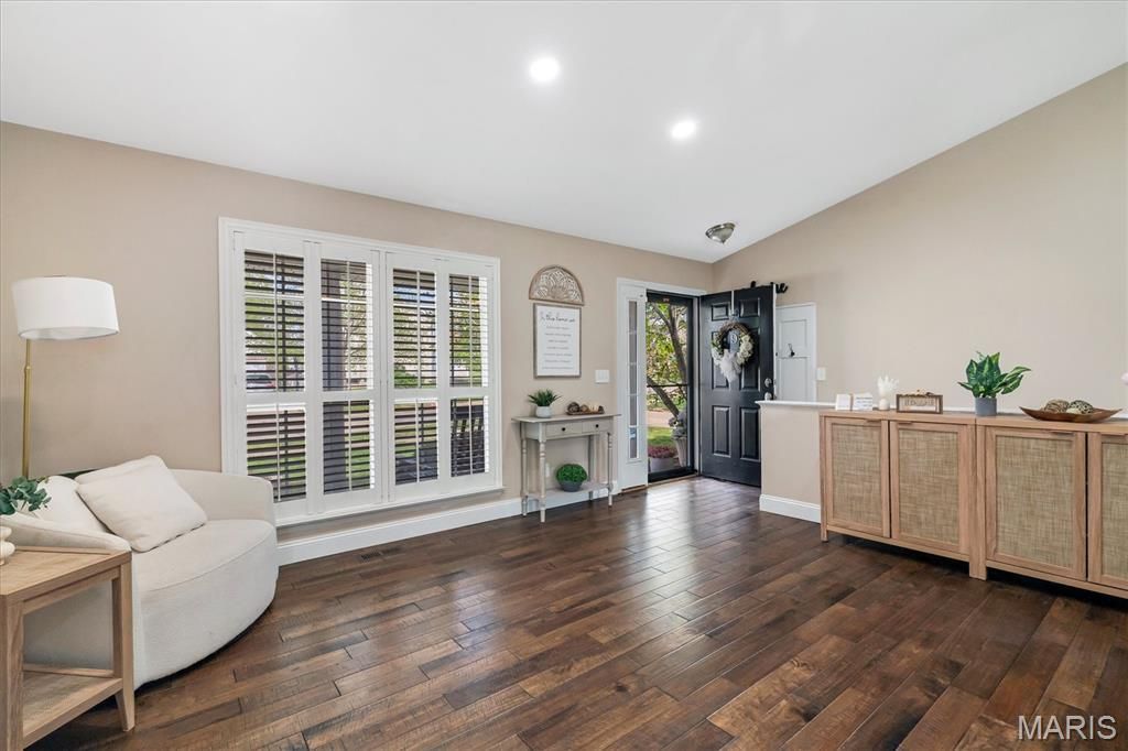 Stunning 5 bed, 3 bath ranch in sought-after Wellington Farm featuring high-end, hand-scraped hardwood flooring throughout the main level and a light-filled open floor plan buyers love. Designed for both everyday living and effortless entertaining, the kitchen showcases stainless steel appliances, Cambria countertops, modern backsplash, and a walk-in pantry with custom built-ins. A true retreat, the primary suite impresses with private access to the deck, custom walk-in closet, and a spa-style bath with double vanities, corner soaking tub, and walk-in shower. Downstairs, the finished walk-out lower level offers a gas fireplace, expansive rec space, two large bedrooms, and a full bath-ideal for guests or extended living. Outdoor living shines with a maintenance-free, partially covered deck with vinyl railings and covered area. High-quality updates include a recently installed roof, gutters, and siding, along with upgraded baseboards, closet doors, plantation shutters, and an oversized 3-car garage. Ideally located near shopping, dining, and award-winning Francis Howell schools.